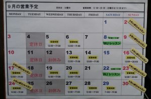 9月の営業予定と各スクール日のご案内です(Twitterでは8月末にご案内させていただいています)。ホームページでは、常時上記のカレンダーページでもご確認いただけます。定休日以外にお休み日と、営業時間変更日が多数ございますのでご確認お願いします。