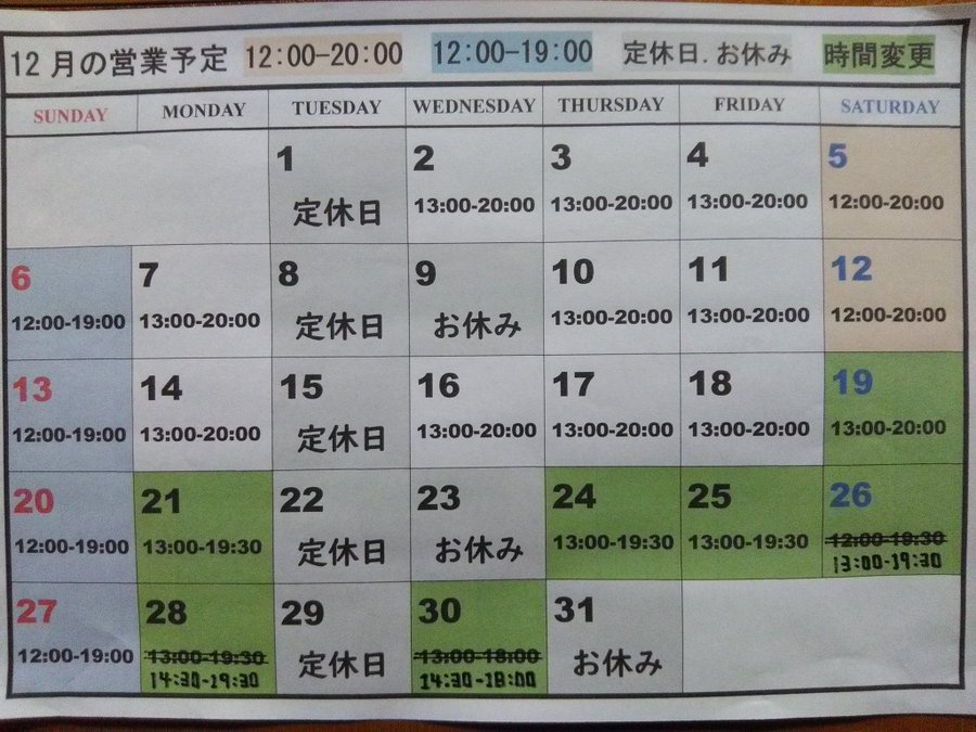 年内営業最終日は、30日(水)です。宜しくお願い致します。