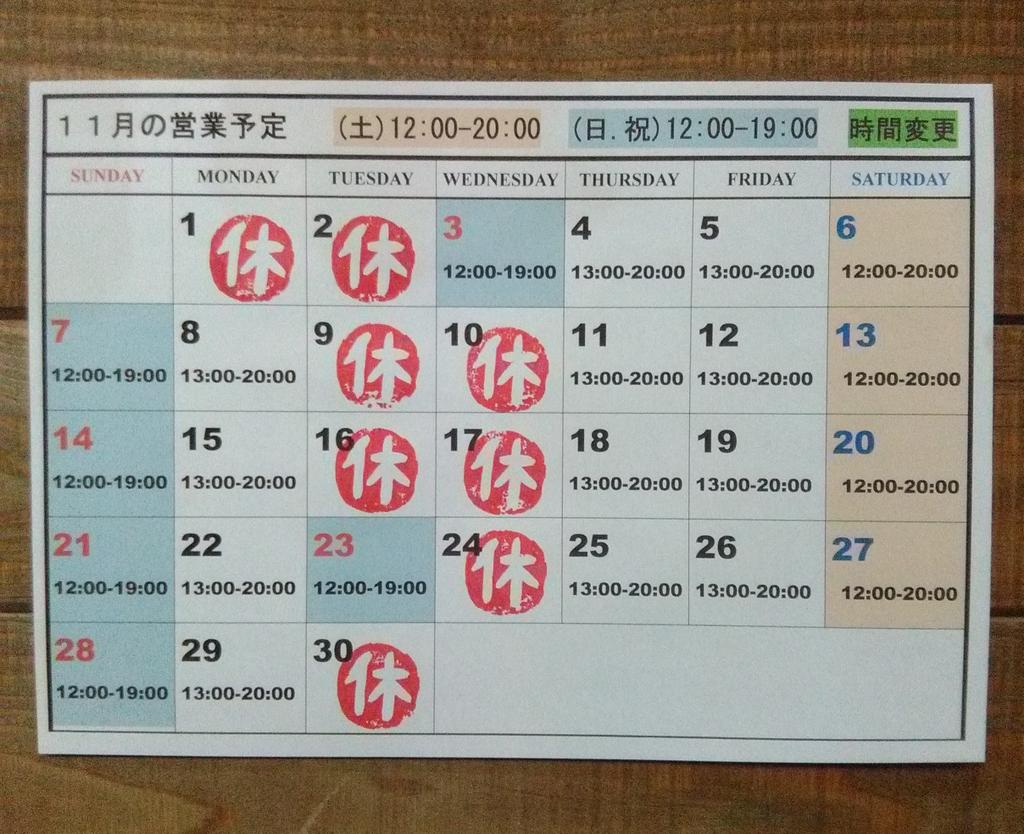 11月の営業ご案内となります。