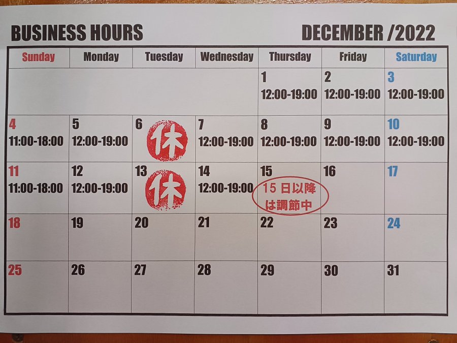 本店のお休み日、営業時間は随時、Twitter、HPで更新させていただきます。ご確認をお願いします。
