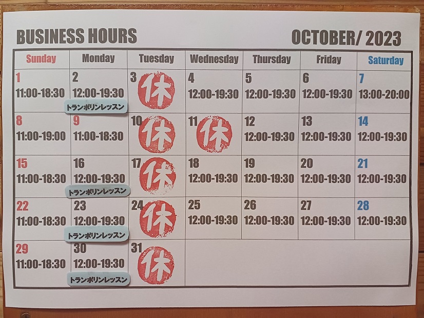 10月の営業ご案内となります。